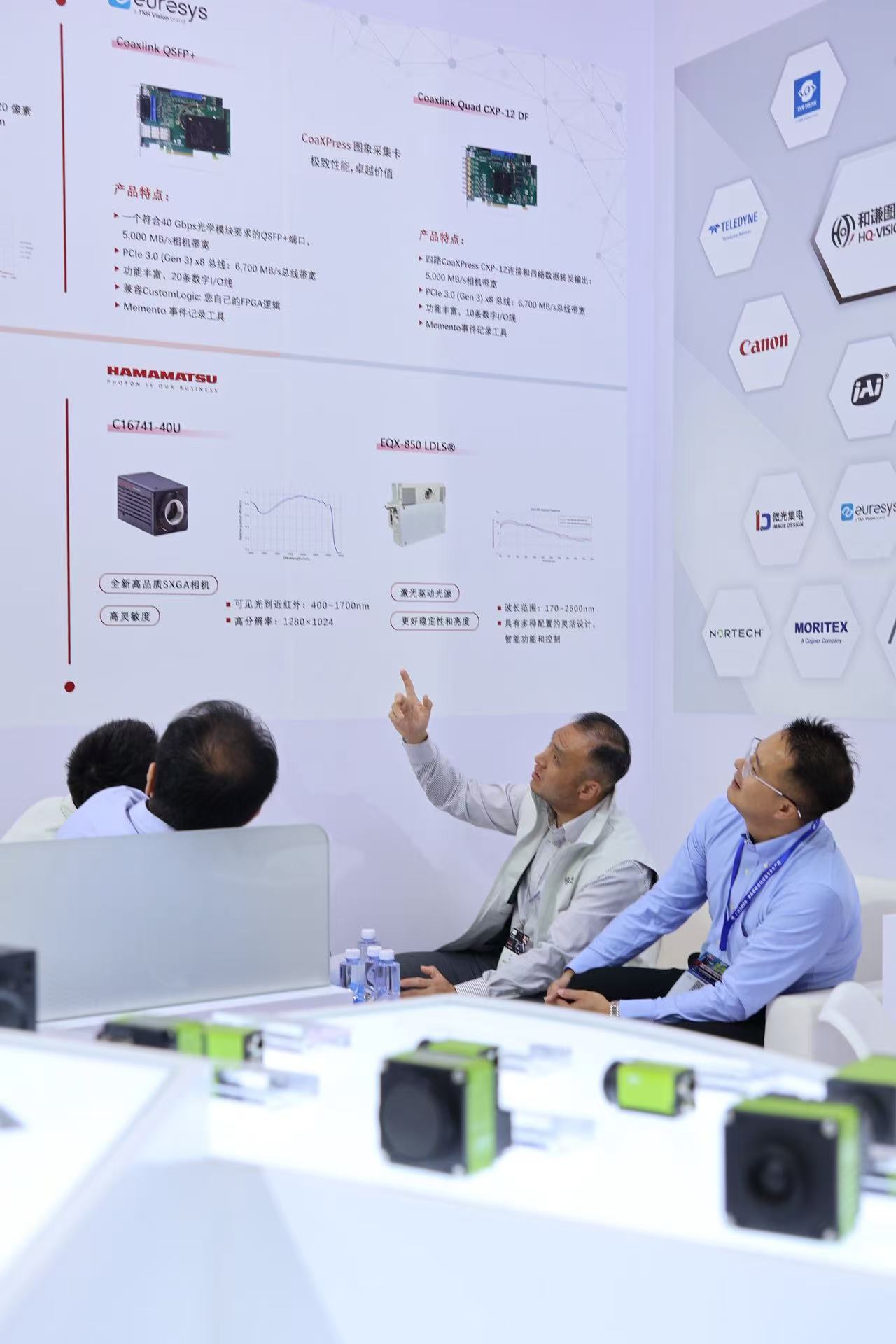 靜態展區陳列的核心部件與解決方案手冊條理清晰,從高分辨率工業相機、精密鏡頭到定制化檢測系統方案,每款產品的參數、應用場景都配有詳盡說明。駐足觀看的客戶絡繹不絕,不時用手機記錄關鍵信息,為后續深入對接留存參考。