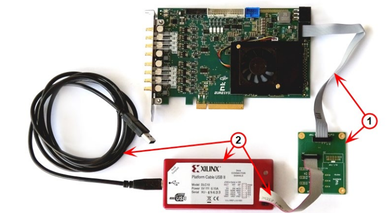 CustomLogic開發工具為XilinxVivado套件,使用的FPGA為Kintex Ultrascale XCKU035,用戶可以使用該FPGA 70%的邏輯資源。通過3613 JTAG適配器Xilinx編程器(圖中①所示)連接到Coalink FPGA進行調試。