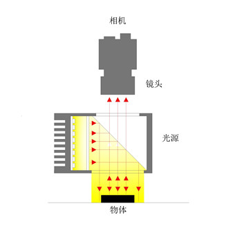 同軸光源主要由高密度LED和分光鏡組成。LED發出光經過分光鏡后,跟CCD和相機在同一軸線上,可以有效消除圖像的重影,適合光潔物體表面劃痕的檢測。