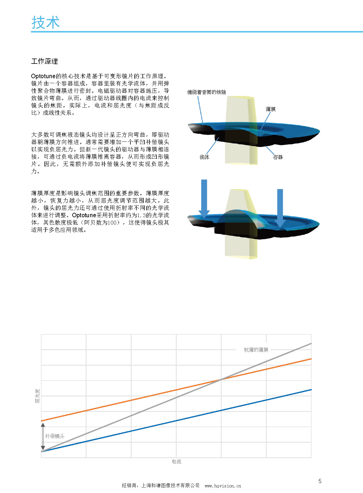 Optotune的核心技術(shù)是基于可變形鏡片的工作原理。鏡片由一個(gè)容器組成,容器里裝有光學(xué)流體,并用彈性聚合物薄膜進(jìn)行密封。電磁驅(qū)動(dòng)器對(duì)容器施壓,導(dǎo)致鏡片彎曲。從而,通過(guò)驅(qū)動(dòng)器線圈內(nèi)的電流來(lái)控制鏡頭的焦距。實(shí)際上,電流和屈光度(與焦距成反比)成線性關(guān)系。