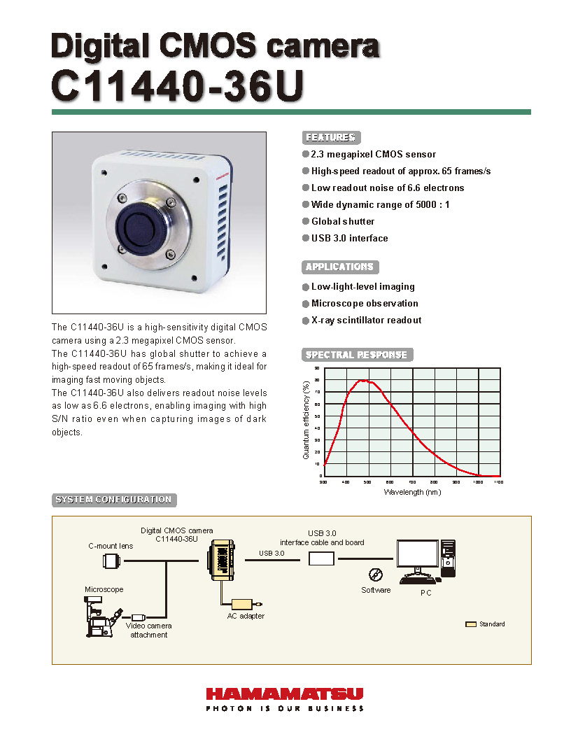 High-speed readout of approx. 65 frames/s Low readout noise of 6.6 electrons Wide dynamic range of 5000 : 1