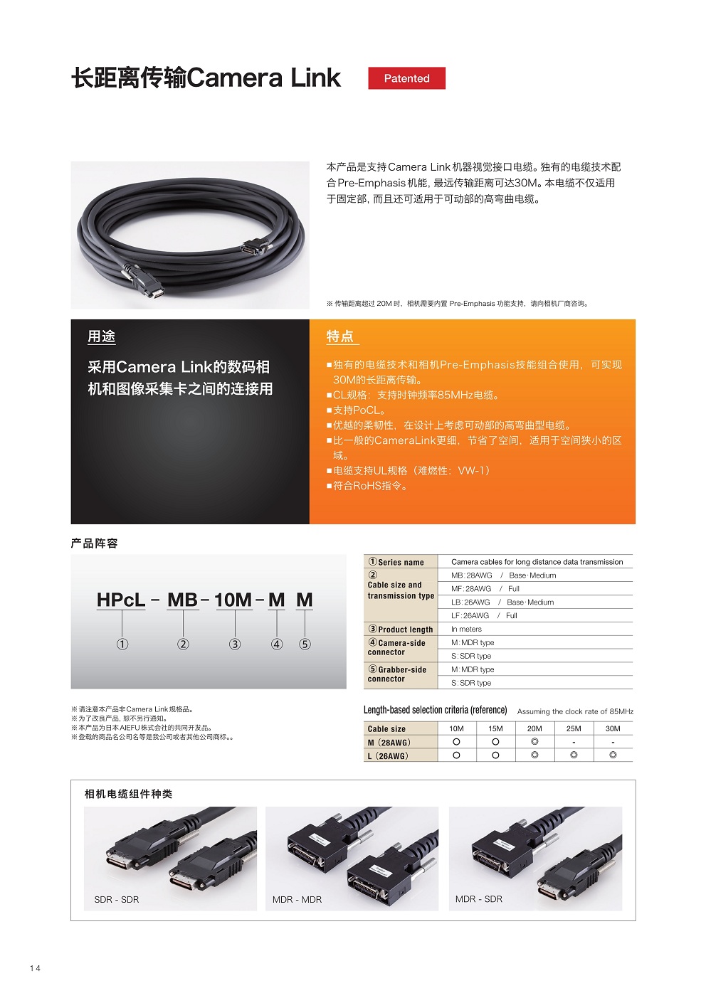 本產(chǎn)品是支持Camera Link機器視覺接口電纜。獨有的電纜技術(shù)配合Pre-Emphasis機能,最遠傳輸距離可達30M。