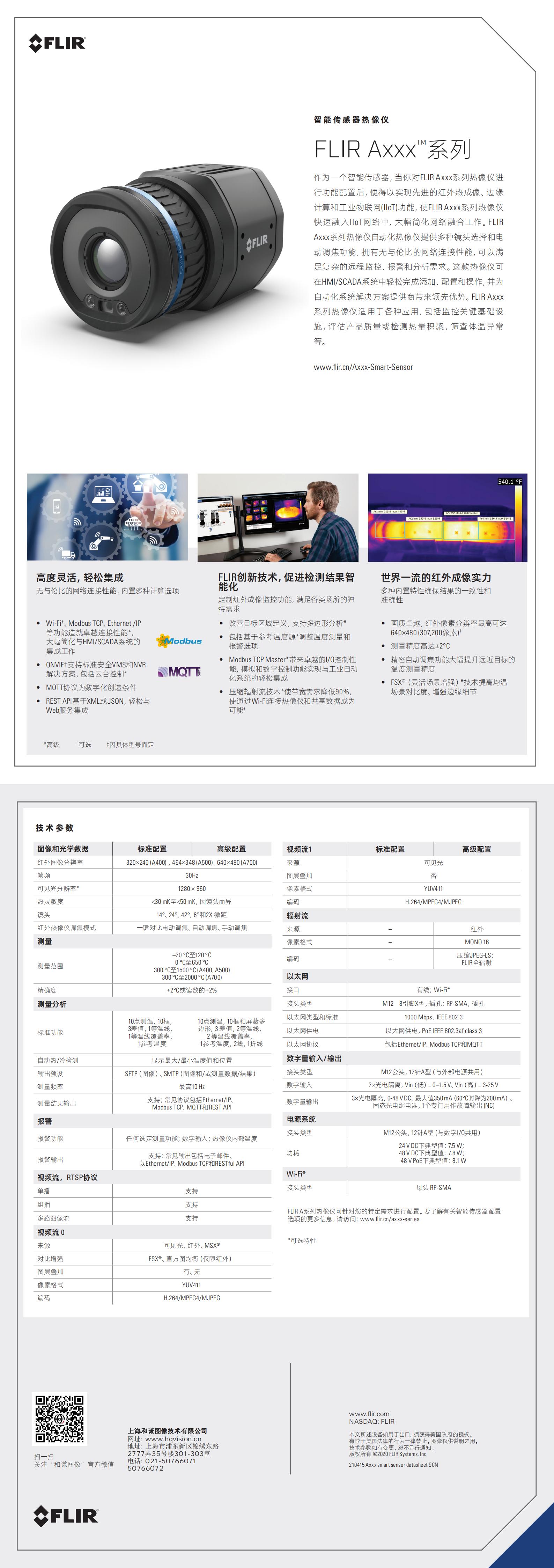 FLIR Axxx 智能傳感器熱像儀性能出色,使自動化解決方案提供商能夠滿足復雜監控應用的需求,包括關鍵基礎設施、產品質量和早期火災檢測。智能傳感器配置包括多種測量工具和報警,同時提供邊緣計算,在熱像儀層面執行分析以立即獲得結果。A400/A500/A700 熱像儀提供多個鏡頭選項、電動調焦控制和無與倫比的連接能力,擁有出色的性能和靈活性。易于配置,使您能夠根據您公司的質量、生產率、維護和安全需求定制監控系統。