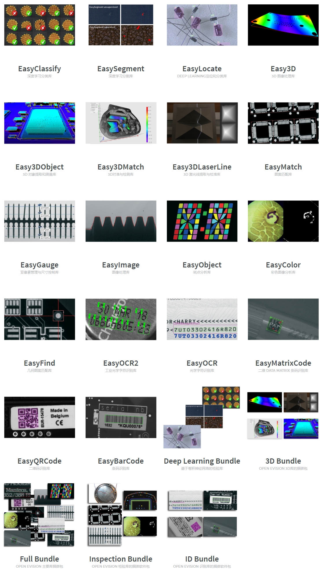 - Full Bundle包含除3D(Easy3D、Easy3DObject、Easy3DMatch和Easy3DLaserLine)和Deep Learning(EasyClassify、EasySegment和EasyLocate)庫之外的所有Open eVision庫。