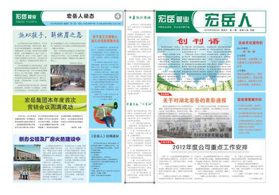 為了豐富公司企業文化,提升企業形象,給所有宏岳人提供一個相互交流,展現自我的平臺,《宏岳人》內刊在宏岳全體員工的矚目中出版啦,在《宏岳人》內刊中,企業文化宣傳欄,創建我們宏岳人獨有的企業文化,公司最新新聞動態簡訊,讓大家更好地了解公司動態,有集團內容的經驗交流,有員工創優爭先的先進事跡,有工作經驗的交流,有健康關愛的小知識,有安全生產小常識,有更多我們宏岳人關心的熱點,在這里我們宏岳人相互的交流,相互傾訴,分享喜悅,分享知識,分享收獲。《宏岳人》內刊就是我們宏岳人自己的報刊,對弘揚企業文化,增強團隊凝聚力的作用;相信我們《宏岳人》會越辦越好。