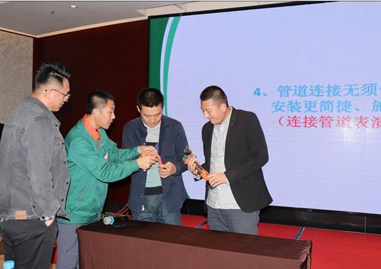 接下來,宏岳集團暖通工程師汪工為大家講解了宏岳1+的施工標準、技術要點及綜合產品系統,并著重介紹了宏岳1+“PE-Xa致純冷熱水管道系統”頭尾一根管、維護更便利等獨特優勢,通過案例講解、現場演示等方式,讓參會人員切實的感受到不一樣的產品、不一樣的宏岳1+。