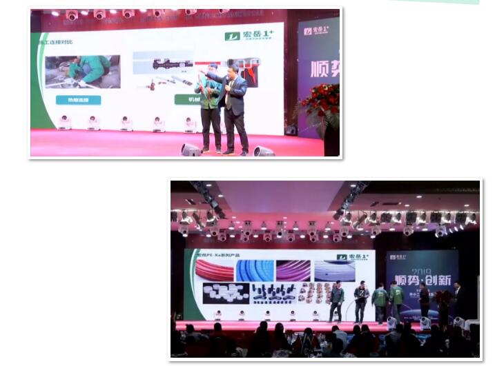 宏岳集團產品高級工程師詳盡介紹了宏岳1+的產品技術以及應用知識,著重講解了pe-xa的優勢特點及施工工藝,現場通過實物實例,充分地展示了宏岳1+產品的技術先進性和質量可靠性。重點提出宏岳1+PE-Xa給水系統較目前市場主流給水系統降低70%的風險點,耐壓高67%,耐溫高32%,會上通過現場實驗,展現了PE-Xa給水管超強的記憶功能,應對變形折傷加熱即可無損復原。