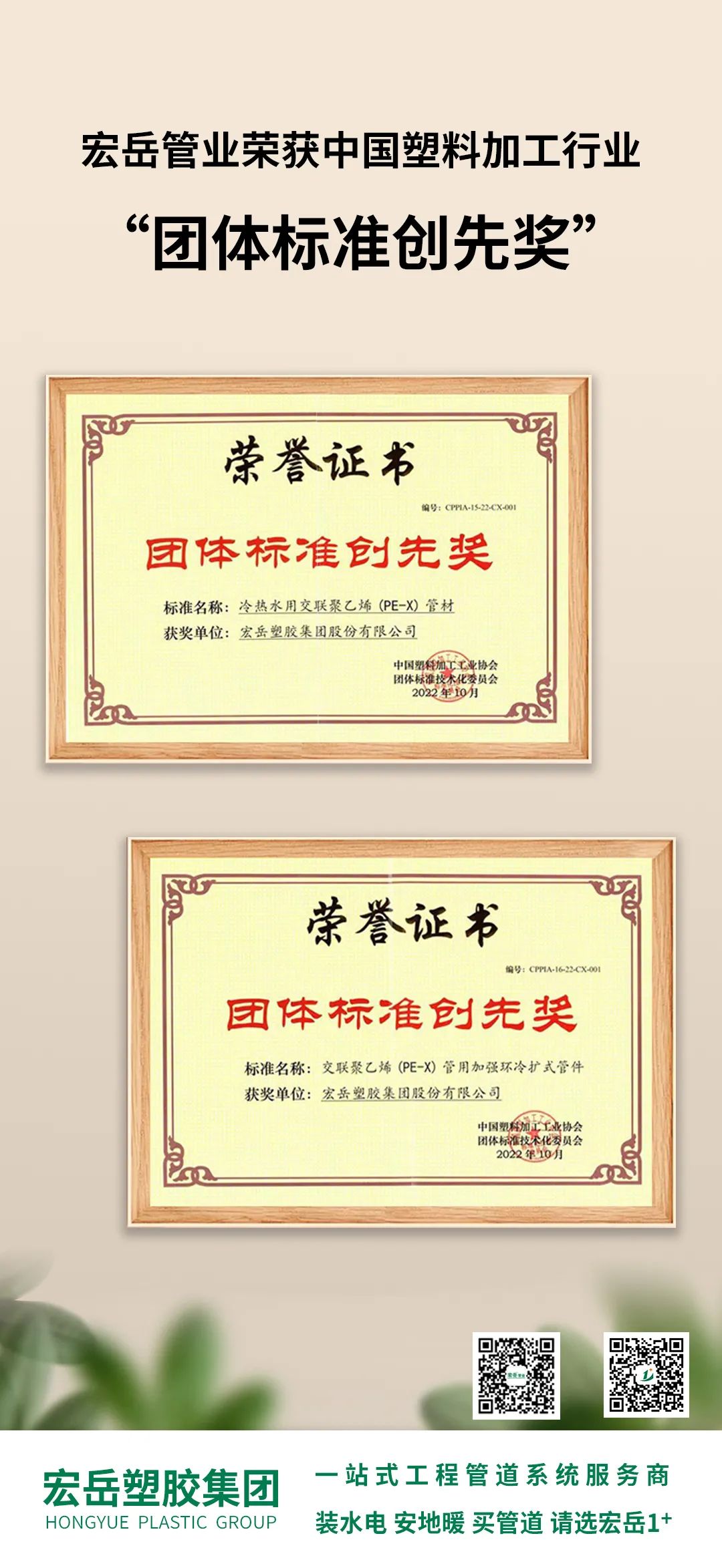 宏岳主導編制的《冷熱水用交聯(lián)聚乙烯(PE-X)管材》、《交聯(lián)聚乙烯(PE-X)管用加強環(huán)冷擴式管件》兩項團標,將產品及連接技術在專業(yè)的角度上給予了注解與規(guī)范,帶動了行業(yè)新產品、新技術的推廣和應用。